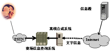 離線合成系統(tǒng)在用戶(hù)電話呼入前,將需要播放的文本信息預(yù)先轉(zhuǎn)換成語(yǔ)音文件存放在系統(tǒng)中,當(dāng)電話用戶(hù)呼入系統(tǒng)后,系統(tǒng)直接向用戶(hù)播放事先生成的語(yǔ)音文件。離線合成方式適用于作賽事快報(bào)、明星風(fēng)采、賽場(chǎng)花絮等公共信息類(lèi)信息服務(wù)。
