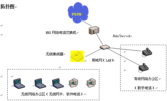 隨著信息時代的來臨,電話、電腦成了辦公領(lǐng)域的重要工具,人們在辦公室通過計算機(jī)網(wǎng)絡(luò)共享數(shù)據(jù)資源、傳遞數(shù)據(jù)信息,彼此間通過電話言語溝通。在人們享受到高科技帶來的高效率的同時,也感到一些不便,例如計算機(jī)網(wǎng)絡(luò)、電話網(wǎng)都需要單獨鋪設(shè)專用的線路,線路的變更往往是讓人心煩的事情。隨著各公司推出無線局域網(wǎng)絡(luò)解決方案(AirConnect)和NBX網(wǎng)絡(luò)電話交換機(jī)平臺的推出,通過無線局域網(wǎng)絡(luò)技術(shù),語音、數(shù)據(jù)兩網(wǎng)合一技術(shù),將電腦、電話機(jī)合二為一,同時從線路的束縛中解放出來。人們再也不用擔(dān)心布線問題,可以隨處移動辦公,享受無線網(wǎng)絡(luò)、無線話音,大大提高人們的辦公效率。