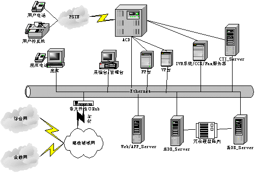 呼叫中心的功能主要有兩方面,一是與用戶(hù)進(jìn)行交互,另外與金融主機(jī)房進(jìn)行數(shù)據(jù)交互。呼叫中心系統(tǒng)由兩部分組成:聲訊平臺(tái)(CALL CENTER)和業(yè)務(wù)數(shù)據(jù)計(jì)算機(jī)網(wǎng)絡(luò)平臺(tái)。聲訊平臺(tái)由話(huà)務(wù)接入設(shè)備(ACD)、IVR系統(tǒng)和CTI服務(wù)器組成,主要負(fù)責(zé)語(yǔ)音資源的管理、呼入話(huà)務(wù)的排隊(duì)、自動(dòng)業(yè)務(wù)以及人工座席的管理等;業(yè)務(wù)數(shù)據(jù)計(jì)算機(jī)網(wǎng)絡(luò)平臺(tái)是對(duì)業(yè)務(wù)數(shù)據(jù)的收集、使用、管理、分析等。平臺(tái)間通過(guò)CTI技術(shù)實(shí)現(xiàn)數(shù)字?jǐn)?shù)據(jù)和語(yǔ)音數(shù)據(jù)的相互轉(zhuǎn)換和同步轉(zhuǎn)移。系統(tǒng)結(jié)構(gòu)如下。