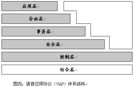 語音應(yīng)用協(xié)議(VAP VA)也有一個(gè)類似于TCP/IP和WAP的層次結(jié)構(gòu),如下圖(圖四)所示: