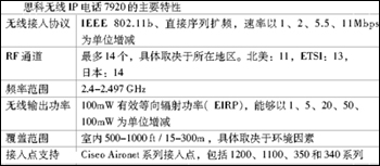 隨著思科無(wú)線IP電話7920的推出,思科公司為用戶提供了融合式無(wú)線解決方案和智能化的無(wú)線基礎(chǔ)設(shè)施,以及一款新產(chǎn)品,從而增強(qiáng)了IP通信在企業(yè)中發(fā)揮的作用。思科無(wú)線IP電話7920是一款方便易用的IEEE 802.11b無(wú)線IP電話,可以與Cisco CallManager和Cisco Aironet 1200、1100、350和340系列Wi-Fi(IEEE 802.11b)接入點(diǎn)配合,提供全面的語(yǔ)音通信功能。作為思科AVVID無(wú)線解決方案的一部分,思科無(wú)線IP電話7920可以在一個(gè)端到端的思科網(wǎng)絡(luò)中提供無(wú)縫的服務(wù),例如安全、移動(dòng)、服務(wù)質(zhì)量(QoS)和管理。