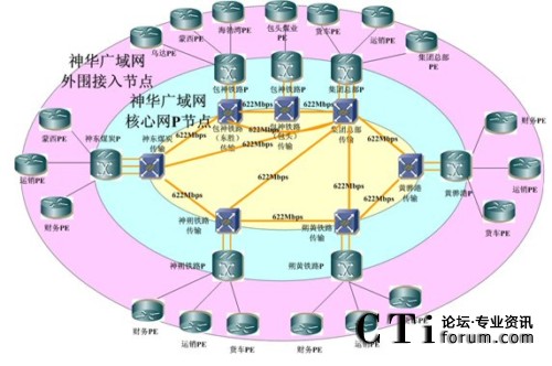 據(jù)神華集團信息管理部廣域網(wǎng)項目負責人說:“該項目建成后將是一個建設在高速傳輸網(wǎng)平臺之上,并利用其提供的線路構(gòu)成廣域網(wǎng)核心節(jié)點之間的互聯(lián)線路,網(wǎng)絡拓撲在7個核心節(jié)點和以北京節(jié)點為中心直連7個核心節(jié)點的放射型622M環(huán)形+放射混合性企業(yè)頂級骨干廣域數(shù)據(jù)網(wǎng)絡結(jié)構(gòu)。該網(wǎng)絡結(jié)構(gòu)可避免任一段光纜中斷造成某節(jié)點直連線路和環(huán)線同時中斷的可能性,即對網(wǎng)絡單點故障實現(xiàn)環(huán)路保護。同時,網(wǎng)絡中斷到恢復的周期大大縮短:傳輸系統(tǒng)中SDH的環(huán)路自愈從中斷到恢復周期為50ms,網(wǎng)絡節(jié)點之間通過IGP的路由收斂,從中斷到恢復的周期約為200ms。”