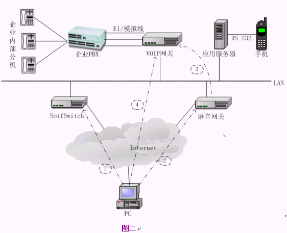 "因特內(nèi)線"還可以實(shí)現(xiàn)Phone2PC呼叫。假如用戶的普通分機(jī)號(hào)碼為"2000",用戶通過(guò)內(nèi)線電話拔打"8002000"("800"是與"2000"對(duì)應(yīng)的PC終端的字冠),由于在企業(yè)交換機(jī)處設(shè)置了路由,用戶發(fā)起的被叫號(hào)碼為"800"打頭的電話就被路由到VoIP網(wǎng)關(guān),VoIP網(wǎng)關(guān)收到呼叫請(qǐng)求后通知SoftSwitch,最終建立與PC終端的呼叫連接。同樣,用戶也可以在市內(nèi)拔打公司的總機(jī),然后打"8002000"呼叫在外地的"2000"用戶。