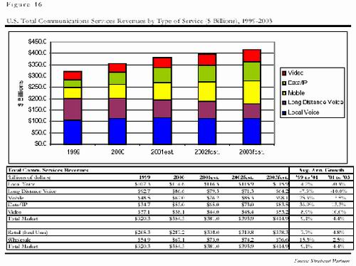 電信市場不是一個孤立的市場,而是由電信服務(wù)和電信制造兩個緊密相連的市場組成的。電信制造業(yè)不斷進行研發(fā)創(chuàng)新,為電信服務(wù)業(yè)提供新的業(yè)務(wù);而電信服務(wù)也利用電信制造業(yè)的新技術(shù),并把這些服務(wù)最終提供給商業(yè)和普通消費者兩類用戶。可以說,電信制造業(yè)的發(fā)展在很大程度上是由電信服務(wù)業(yè)決定的。要了解電信制造市場的將來,不得不從電信服務(wù)市場的變化談起。