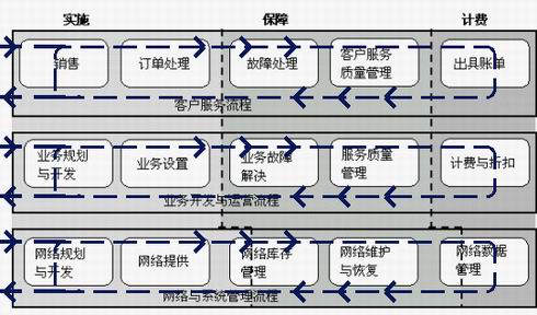 由于是從技術(shù)的角度出發(fā),國(guó)內(nèi)在介紹OSS的時(shí)候,是以實(shí)施、保障和計(jì)費(fèi)縱向的角度介紹的,而當(dāng)我們認(rèn)真地考察TOM圖時(shí)會(huì)發(fā)現(xiàn),OSS最大的意義是橫向的,即從橫向看的TOM圖的每一層,正好構(gòu)成一個(gè)完整的業(yè)務(wù)循環(huán),從上到下依次為:客戶服務(wù)流程、運(yùn)營(yíng)流程和系統(tǒng)管理流程。電信企業(yè)只有按照TOM圖來(lái)規(guī)劃自己的業(yè)務(wù)部門劃分和相互銜接,才能最大限度地利用OSS所能提供的支持。而現(xiàn)有運(yùn)營(yíng)商的部門設(shè)置都仍是縱向劃分的,要轉(zhuǎn)成按流程橫向劃分,必須要對(duì)電信運(yùn)營(yíng)管理有深入了解。國(guó)內(nèi)介紹OSS的企業(yè)大都是系統(tǒng)集成商,不懂電信運(yùn)營(yíng),同時(shí)為了自己銷售的需要,都是從技術(shù)的角度縱向介紹,更進(jìn)一步加大了運(yùn)營(yíng)商利用OSS體系實(shí)現(xiàn)管理轉(zhuǎn)型的難度。