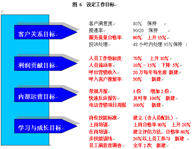 | 1 | 分4批招聘100位新員工,滿(mǎn)足話(huà)務(wù)量增長(zhǎng)的需要 | 接通率90% 上崗合格率80% 工作飽和度70% |