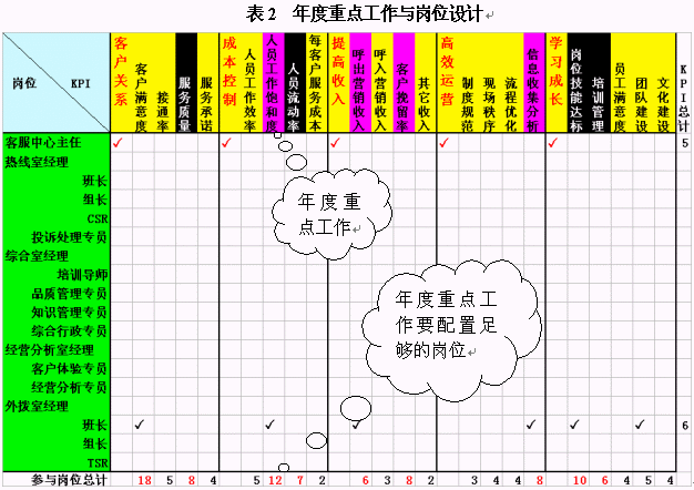 在這里,我們先以崗位設(shè)計(jì)來(lái)舉例。經(jīng)常有呼叫中心主管把每個(gè)崗位的職責(zé)都設(shè)計(jì)的非常詳細(xì),包括了每天來(lái)做什么,說(shuō)什么,錄入什么,甚至是打掃某區(qū)域衛(wèi)生之類(lèi)。但是,我看遍了每一條,也沒(méi)找到這個(gè)崗位應(yīng)該對(duì)什么業(yè)績(jī)"負(fù)責(zé)任",該對(duì)哪些工作做出貢獻(xiàn)。此處建議各位把效益評(píng)價(jià)體系、年度重點(diǎn)工作與崗位設(shè)計(jì)結(jié)合起來(lái)。如表2所示,我們可以把效益評(píng)價(jià)體系作為KPI放在橫坐標(biāo)中,而崗位設(shè)置則是縱坐標(biāo)。每個(gè)崗位對(duì)應(yīng)的行中,可以勾畫(huà)其應(yīng)負(fù)責(zé)或者做出主要貢獻(xiàn)的項(xiàng)目。這些項(xiàng)目不能超過(guò)6個(gè),因?yàn)樘嗟捻?xiàng)目會(huì)使得這個(gè)崗位無(wú)所適從,最終的結(jié)果是哪個(gè)也沒(méi)做好。當(dāng)你勾畫(huà)完成之后,請(qǐng)計(jì)算每列的"對(duì)勾"數(shù)目,看看你本年度的重點(diǎn)工作是不是有較多崗位負(fù)責(zé)呢?