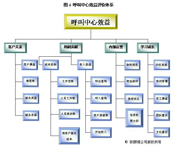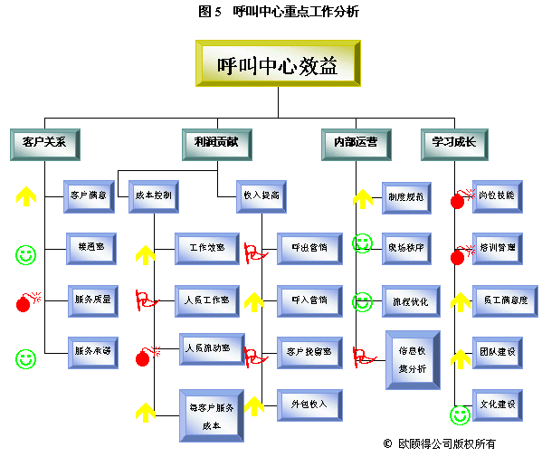 根據(jù)年度重點(diǎn)工作及目標(biāo),我們就可以設(shè)計(jì)關(guān)鍵措施來(lái)使其實(shí)現(xiàn)。通常一項(xiàng)關(guān)鍵措施可以有助于幾個(gè)目標(biāo)的達(dá)成。如建立培訓(xùn)體系,可以使得在崗培訓(xùn)、上崗培訓(xùn)、多技能訓(xùn)練以及崗位技能達(dá)標(biāo)率有所提升,而體現(xiàn)在業(yè)務(wù)上的效果則是服務(wù)質(zhì)量的提升、呼出營(yíng)銷(xiāo)收入增加和客戶(hù)挽留率提高。
