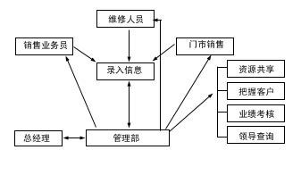 根據(jù)英普的業(yè)務(wù)管理模式,公司將門市銷售、維修部、大客戶部的業(yè)務(wù)管理工作,交由管理部全部管理和協(xié)調(diào),這三個(gè)部門將各自與客戶接待、交往過程、工作計(jì)劃全部明細(xì)記錄,交由管理部確認(rèn),管理部在保證必要保密的情況下,進(jìn)行工作再分配,同時(shí)加強(qiáng)業(yè)務(wù)考核和其他管理職能工作。其業(yè)務(wù)流程如圖1。