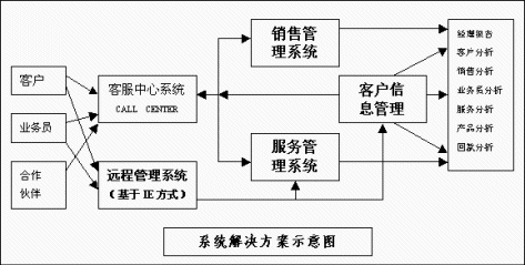 易達(dá)CRM在提供客戶(hù)信息管理、銷(xiāo)售管理、潛在客戶(hù)管理和服務(wù)管理基礎(chǔ)上,還充分集成了低價(jià)位的呼叫中心系統(tǒng)(Call center),以及基于IE方式的遠(yuǎn)程處理系統(tǒng),其功能框圖如下: