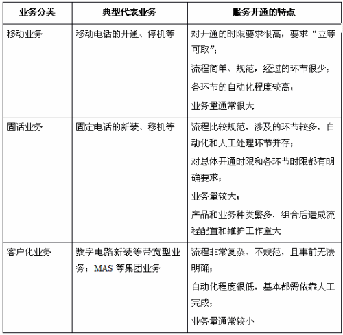 同時全業(yè)務運營也帶來了許多新的服務開通方面的需求。首先,全業(yè)務運營環(huán)境下,運營商為了更快地占領市場和吸引客戶,會推出大量的套餐和捆綁組合產(chǎn)品,這就會引發(fā)流程和環(huán)節(jié)同步的需求,包括多個環(huán)節(jié)同時開始、同時結束、串行等。例如開通一個同時包含固定電話、移動電話的產(chǎn)品包,要求固定電話與移動電話可同時施工、同時竣工。此外,套餐和捆綁組合產(chǎn)品對環(huán)節(jié)級別也存在協(xié)同需求,例如常見的電話與ADSL開通,由于電話與ADSL在技術實現(xiàn)上共用線路,因此這兩個開通流程裝機環(huán)節(jié)需要協(xié)同配合,允許兩個流程同時開始。此外,隨著增值業(yè)務的大量涌現(xiàn),由于增值業(yè)務的數(shù)量眾多,會給維護人員帶來大量的流程配置工作。例如,客戶在申請裝機時可同時申請開通很多增值業(yè)務,不同增值業(yè)務可能由不同的業(yè)務平臺支持,需要到不同的業(yè)務平臺進行施工,裝機流程的配置需支持眾多環(huán)節(jié),且日后會面臨增加新業(yè)務時大量的修改工作量。
