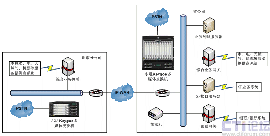 東進(jìn)固網(wǎng)支付平臺(tái)通過IP專網(wǎng)將省公司和各地市公司的系統(tǒng)連接起來,采取二級地市分公司數(shù)據(jù)接入、運(yùn)營商總部集中處理的拓?fù)浼軜?gòu),實(shí)現(xiàn)業(yè)務(wù)的全省統(tǒng)一運(yùn)營。各地市公司分別建設(shè)一套接入平臺(tái),業(yè)務(wù)處理服務(wù)器統(tǒng)一建設(shè)在運(yùn)營商總部。各地市的水、電、煤氣、電信、彩票等外部系統(tǒng)通過在本地建設(shè)的綜合業(yè)務(wù)網(wǎng)關(guān)與業(yè)務(wù)系統(tǒng)對接,支付業(yè)務(wù)統(tǒng)一通過運(yùn)營商總部所在地銀聯(lián)轉(zhuǎn)到各地銀聯(lián)進(jìn)行。