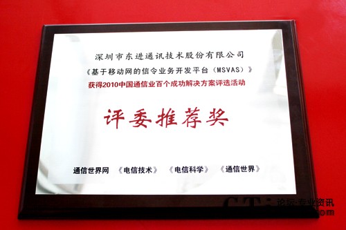 從2010年7月起評選進(jìn)入征集階段,經(jīng)過長達(dá)3個月的層層篩選,最終百個成功解決方案出爐,并由多家主流媒體公示。東進(jìn)技術(shù)“基于移動網(wǎng)的信令業(yè)務(wù)開發(fā)平臺(MSVAS)”解決方案憑借出眾的實(shí)用經(jīng)濟(jì)性、安全可靠性、靈活性和成熟性,經(jīng)過兩個月網(wǎng)絡(luò)初選,和近百位運(yùn)營商層面專業(yè)人士組成的組委會技術(shù)終選后獲此殊榮。