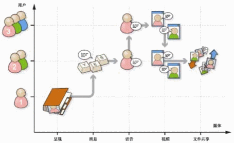 如圖1所示,用戶首先打開基于呈現(xiàn)業(yè)務(wù)的地址簿,向其好友發(fā)送一條消息,然后向該好友發(fā)起一個(gè)話音呼叫,在通話過(guò)程中又添加一個(gè)新的對(duì)象,隨后在這個(gè)多方通話中又添加了視頻業(yè)務(wù),接下來(lái)又去除一個(gè)對(duì)象,多方通話恢復(fù)為雙方通話,最后使用了文件共享業(yè)務(wù)。所有這些多媒體業(yè)務(wù)都是由用戶的一個(gè)SIP會(huì)話控制和激活的。