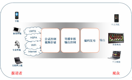 如今手機能拍照、攝像并不稀奇,攝像頭幾乎成了手機的標準配置,視頻通話也是3G特色業(yè)務之一,但要把手機拍攝的圖像實時回傳到電視臺,并合理地發(fā)送到直播節(jié)目中卻還需要打通很多環(huán)節(jié)?偟膩碚f,電視臺需要的是一個業(yè)務控制平臺,使后臺導播人員能監(jiān)控、審核手機回傳的多路視頻信號,根據(jù)需要選取其中的合適內(nèi)容插入到直播節(jié)目中,同時系統(tǒng)還應該能夠根據(jù)需求同時輸出各種格式的視頻,發(fā)布到電視頻道、互聯(lián)網(wǎng)或者手機電視中。
