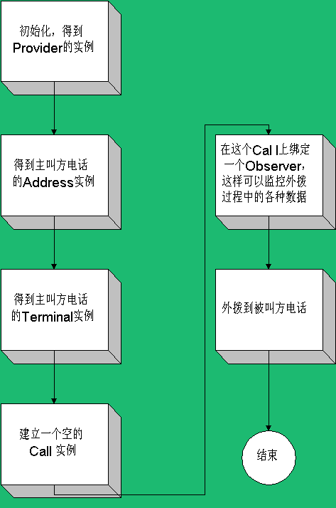 對象包分析:JTAPI的對象包除了核心包以外都提供自己獨特的功能。核心包比較特殊,按照面向?qū)ο蟮睦碚,核心包是其它包的父類。核心包只能夠提供最基本的電話功能,而其它對象包則是核心包的擴展。比如針對核心包中的對象Call,呼叫控制包有專門的對象CallControlCall,后者具有前者的所有屬性和方法,并在前者的基礎(chǔ)上添加了專門的屬性和方法。比如CallControlCall和Call都有方法connect(),而CallControlCall更有自己獨有的方法conference()、transfer()。簡單的說,實際上核心包的對象Call可以提供基本的電話功能,如外撥、接聽、掛機等。而呼叫控制包的對象CallControlCall不僅有基本的電話功能,還有特殊的會議電話、轉(zhuǎn)接電話、監(jiān)聽電話等功能。同樣呼叫中心專用包的電話對象CallCenterCall也是一樣,它的特殊功能有預(yù)撥電話、得到用戶數(shù)據(jù)等方法。