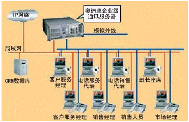 * 小型呼叫中心:座席數(shù)目在50個(gè)以下。投資一般在50萬(wàn)元以下。這種系統(tǒng)結(jié)構(gòu)與第二種類(lèi)似,但使用較小型PBX,或用板卡代替,業(yè)務(wù)代表座席、應(yīng)用服務(wù)器及數(shù)據(jù)庫(kù)大小在量上均作相應(yīng)減少,它主要適合中小型企業(yè)的業(yè)務(wù)需要。