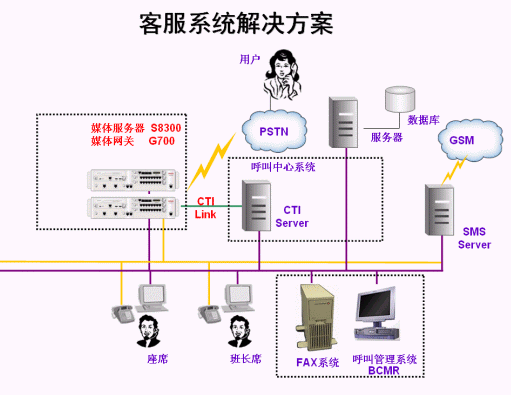 - 采用AVAYA S8300交換機(jī)做為客戶服務(wù)中心的核心電話接入平臺(tái),系統(tǒng)中配置CTI接口模塊和內(nèi)置的自動(dòng)呼叫分配軟件包。