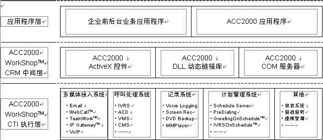 ACC2000 Workshop是聲訊科技集團(tuán)為基于Microsoft Windows操作系統(tǒng)的CRM應(yīng)用軟件開發(fā)所建立的開發(fā)平臺(中間件)。以ACC2000 Workshop為基礎(chǔ)的ACC2000集成多媒體溝通中心采用三層結(jié)構(gòu),利用ACC2000 Workshop的CRM中間層所提供的ActiveX控件、DLL動態(tài)庫以及COM組件,就可以很容易地將溝通中心的各種功能融合到前端應(yīng)用程序中。ACC2000 Workshop的CTI執(zhí)行層接受中間件發(fā)來的請求,處理ACC2000的各項(xiàng)服務(wù)功能,并向CRM應(yīng)用程序返回執(zhí)行結(jié)果。見下圖。