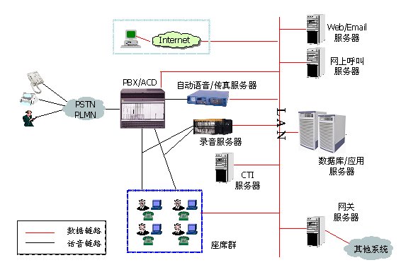 多媒體呼叫中心平臺包括:排隊機(PBX/ACD)、CTI服務(wù)器、WEB服務(wù)器、自動語音系統(tǒng)(IVR/VRU)、錄音系統(tǒng)、座席終端等。