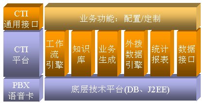 客戶服務(wù)系統(tǒng)由接入平臺和應(yīng)用軟件兩部分組成。接入平臺包括硬件接入設(shè)備,CTI中間件;應(yīng)用軟件實現(xiàn)咨詢、查詢、業(yè)務(wù)受理、投訴、故障申告及外呼服務(wù)等功能。