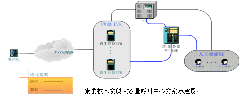 該方案利用青牛USE、網(wǎng)絡(luò)IVR等產(chǎn)品,通過青牛網(wǎng)絡(luò)IVR節(jié)點間的集群,實現(xiàn)了對呼叫中心的重新釋義,實現(xiàn)了呼叫中心的線性擴(kuò)容,有效解決以下問題: