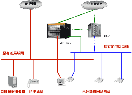 如果您不想放棄原來(lái)的交換機(jī),也可以將Altiserv接入用戶(hù)交換機(jī)的輸出端,在這種方案下,原有分機(jī)依然保留,原有布線(xiàn)不用改變,但是原有分機(jī)電話(huà)已經(jīng)升級(jí)為網(wǎng)絡(luò)電話(huà)。(綠色虛線(xiàn)為仍保留原來(lái)交換機(jī)的聯(lián)接方案)