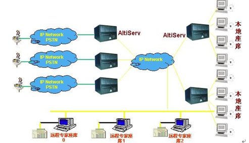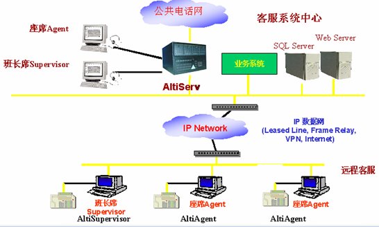這種組合節(jié)省管理成本,因?yàn)樗械淖瘑T都在一點(diǎn),便于管理控制,同時(shí)用戶只要撥打本地電話即可進(jìn)入系統(tǒng)接收服務(wù),如需人工座席應(yīng)答的話系統(tǒng)會(huì)自動(dòng)將來電通過Internet轉(zhuǎn)接到座席員處,對公司的話費(fèi)成本也較低(都是通過Internet實(shí)現(xiàn)的長途轉(zhuǎn)接功能)。同時(shí)AltiGen也支持通過IP分機(jī)的方式遠(yuǎn)程登錄到系統(tǒng)實(shí)現(xiàn)遠(yuǎn)程座席的功能,這樣對有些高級(jí)話務(wù)員或?qū)<易槐孛刻斓焦旧习,可以通過家里的電腦登錄到AltiGen系統(tǒng),作為系統(tǒng)的一個(gè)分機(jī)來完成所有的座席員的功能,在他的電腦屏幕上也能彈出來電人的信息。系統(tǒng)的組網(wǎng)圖如下: