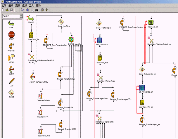 GVP提供了界面友好的功能強大的語音應用開發(fā)工具-Genesys Studio,其中預定了豐富的控件,用來實現(xiàn)菜單語音播報、DTMF收集以及對數(shù)據(jù)庫查詢等諸多功能。通過拖放的方式就可以快速的隨心所欲地設計出你所需要的語音邏輯應用流程,最終編譯產(chǎn)生用于發(fā)布的ASP或者JSP頁面。應用之間可以彼此調用,提高了語音應用的靈活性和可重用性。Genesys Studio還提供了靈活實用的調試工具,可以隨意設置斷點實時跟蹤流程的執(zhí)行情況,極大的方便了語音應用流程的調試。