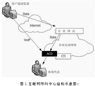 互聯(lián)網(wǎng)呼叫中心是在互聯(lián)網(wǎng)技術飛速發(fā)展的基礎上所產生的。對于客戶而言,完全的互聯(lián)網(wǎng)呼叫中心和傳統(tǒng)呼叫中心最大的區(qū)別就在于客戶無需電話,只要從一個Web站點就可以直接進入互聯(lián)網(wǎng)呼叫中心。這樣一來,呼叫中心就從傳統(tǒng)形式上的“撥號-交談(Dial to Talk)”發(fā)展到現(xiàn)代形式的“點擊-交談(Click to Talk)”。典型的互聯(lián)網(wǎng)呼叫中心結構如圖1所示。