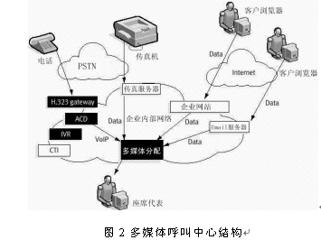 多媒體呼叫中心實際上是基于CTI技術的傳統(tǒng)呼叫中心和互聯(lián)網(wǎng)呼叫中心的相互結合,其接入手段不但有傳統(tǒng)的電話、而且包括了傳真接入、Email接入、Web接入和IP電話接入等。典型的多媒體呼叫中心結構如圖2所示。