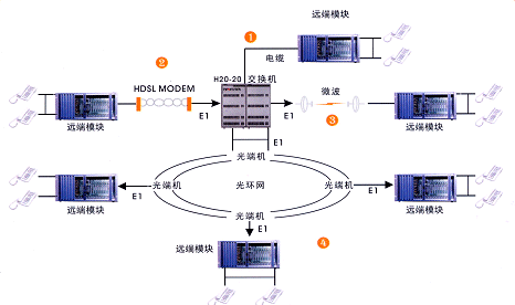遠端模塊通過標準 2M ( E1 )接口與交換機連接。該接口不受傳輸距離和傳輸設(shè)備的限制。常用的傳輸設(shè)備有 SDH 、 PDH 光端機(光纜),數(shù)字微波、數(shù)字擴頻, HDSL 調(diào)制解調(diào)器(雙絞線)等。
