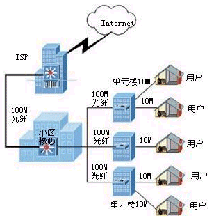 寬帶小區(qū)網(wǎng)絡(luò)建設(shè)采用基于三層交換的千兆以太技術(shù),在小區(qū)核心引入帶光口的千兆以太網(wǎng)交換機(jī),通過光纖以千兆速率上連至ISP接入?yún)^(qū)域交換機(jī)。小區(qū)內(nèi)部形成星型結(jié)構(gòu),每棟單元樓內(nèi)放置帶百兆光口的以太網(wǎng)交換機(jī),通過百兆光纖將小區(qū)核心和單元樓連接起來(lái)。樓宇內(nèi)部布放五類線,連至用戶計(jì)算機(jī)的網(wǎng)卡,使最終用戶上網(wǎng)速率達(dá)到10M或更高。