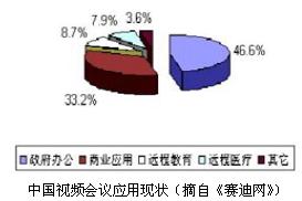 視頻會議在我國的應(yīng)用現(xiàn)狀如下圖所示。政府辦公占全部市場份額的46.6%。為了改善運營模式、提高工作效率,電信、金融、鐵路、電力等行業(yè)也在大力發(fā)展視頻會議系統(tǒng),占據(jù)了33.2%的市場份額。與以上領(lǐng)域相比,我國的遠(yuǎn)程教育和遠(yuǎn)程醫(yī)療尚處于發(fā)展初期,所占份額分別是8.7%和7.9%。這反映視頻會議系統(tǒng)在遠(yuǎn)程教育、遠(yuǎn)程醫(yī)療等方面建設(shè)力度還不夠大。不過,據(jù)我們研究表明,這兩個領(lǐng)域的應(yīng)用近年來呈現(xiàn)出蓬勃發(fā)展的勢頭,相信很快就會有良好的表現(xiàn)。