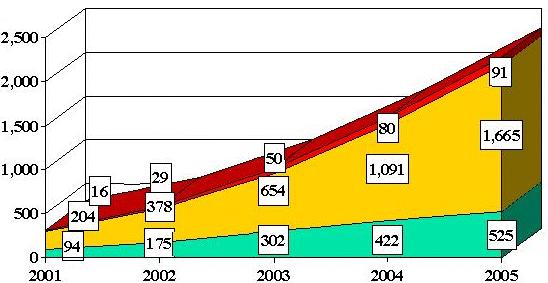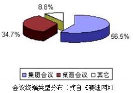 視頻會議的功能主要包括音視頻功能和數(shù)據(jù)共享功能。數(shù)據(jù)共享是指通過視頻會議系統(tǒng)使身處異地的合作者相互了解情況并共享數(shù)據(jù)應(yīng)用(例如電子白板、共享文檔、協(xié)同瀏覽等)。根據(jù)對視頻會議功能側(cè)重點的不同,視頻會議系統(tǒng)分為視頻會議終端(也稱集團(tuán)會議終端)和網(wǎng)絡(luò)會議終端(也稱桌面會議終端)。視頻會議終端經(jīng)過專門設(shè)計,功能完善,安裝在特定的會議室中,不能隨意移動,能夠?qū)崿F(xiàn)復(fù)雜的視頻會議;網(wǎng)絡(luò)會議終端一般是經(jīng)過專門設(shè)計的個人計算機(jī),它既可以作為普通計算機(jī)使用,又可以作為會議終端,是實現(xiàn)會議、數(shù)據(jù)等綜合應(yīng)用的平臺。如下圖所示,集團(tuán)會議終端所占份額為56.5%,桌面會議終端為34.7%。網(wǎng)絡(luò)會議終端盡管發(fā)展時間不長,但由于其較好地集成了會議、數(shù)據(jù)等應(yīng)用,其市場份額也頗為可觀,而且近年來增長十分迅速。