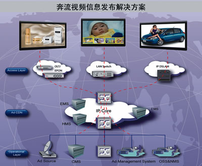 UT斯達(dá)康緊跟市場發(fā)展趨勢和運(yùn)營商步伐,深入研究戶外液晶廣告業(yè)務(wù)的發(fā)展、大力推進(jìn)廣告平臺的研發(fā)。2006年,UT斯達(dá)康推出了奔流(RollingStream)視頻信息發(fā)布解決方案(如圖2所示)。奔流視頻信息發(fā)布解決方案是以奔流(RollingStream)IPTV平臺為基礎(chǔ),結(jié)合戶外液晶廣告市場需求,融合運(yùn)營商以視頻為主的綜合信息發(fā)布的需求,真正運(yùn)營級的電信級解決方案。該方案可以幫助運(yùn)營商實現(xiàn)融合信息服務(wù)和廣告業(yè)務(wù)的統(tǒng)一運(yùn)營,幫助運(yùn)營商開展兼具公益性和盈利性的信息發(fā)布業(yè)務(wù),運(yùn)營商在推進(jìn)社會信息化、造福公眾的同時,通過視頻廣告的運(yùn)營,也能獲取盈利。該方案基于電信級平臺的穩(wěn)定性、安全性、擴(kuò)展性設(shè)計要求,可支持百萬級大規(guī)模部署能力,可提供電信級質(zhì)量保證的服務(wù);該方案基于IP流媒體技術(shù),可通過IP網(wǎng)絡(luò)實時、精準(zhǔn)、互動地投放廣告內(nèi)容,從而可以支持豐富、新穎的廣告運(yùn)營模式;該方案基于數(shù)字多媒體技術(shù),除了可以發(fā)布視頻廣告,還可以發(fā)布圖片、文字、消息等廣告內(nèi)容。