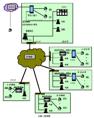 。。本方案有主要配置:總公司配備1臺EEGW8601E1網(wǎng)關(guān)、四個分公司分別配備1臺EEGW8504FXO網(wǎng)關(guān),四個辦事處分別配備1臺EEGW8204FXO網(wǎng)關(guān)。在總公司出可以安裝EEGK8001簡易網(wǎng)閘。