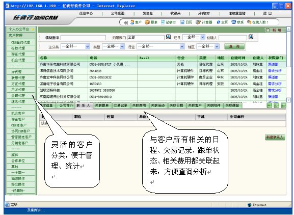 任我行-協(xié)同CRM把企業(yè)各部門與客戶交往過(guò)程中的所有記錄,比如業(yè)務(wù)記錄、業(yè)務(wù)員日程按排、客服記錄、銷售過(guò)程、工作報(bào)告、業(yè)務(wù)合同、銷售記錄、銷售費(fèi)用等,進(jìn)行這樣分類管理,這樣,就把企業(yè)離散的客戶資料統(tǒng)一管理起來(lái),把企業(yè)個(gè)部門與客戶的銷售過(guò)程及服務(wù)等信息象珠子一樣串起來(lái),而不是以前那種散亂、信息殘缺,讓查閱者對(duì)所需要關(guān)注的客戶"一目了然"。