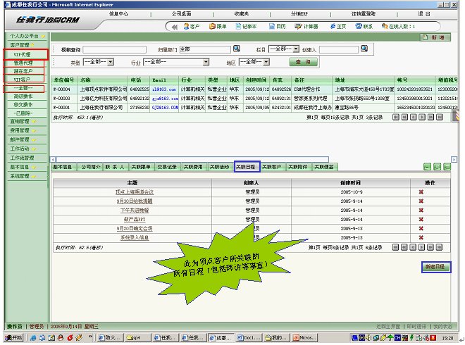 和傳統(tǒng)日程相比,傳統(tǒng)日程是不和客戶掛鉤的,事后查閱很不方便,就好比在一個(gè)筆記本上去查詢以前的筆記,要找出與某個(gè)客戶的日程安排,根本不可能,而且,很多人的備忘錄寫(xiě)了之后,也不會(huì)再去翻閱了。有了客戶相關(guān)聯(lián)的日程后,以后通過(guò)客戶為入口,可以很清楚的查閱XX時(shí)候,XX人和該客戶交往的日程安排及記錄。