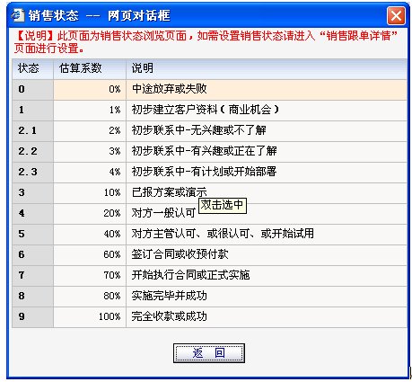 銷售過(guò)程量化管理,即對(duì)銷售活動(dòng)進(jìn)展的數(shù)字化。從目標(biāo)客戶建立到簽約成交的過(guò)程中,按客戶需求變化以及我們提供咨詢的不同來(lái)分成若干個(gè)階段,我們把這些不同的階段描述出來(lái),并用一個(gè)數(shù)字或百分比來(lái)替代。如:10%指的是客戶有這方面的需求意向,但對(duì)我們并沒(méi)有特別的關(guān)注;50%即可以表示需求強(qiáng)烈并偏愛(ài)于我們;而70%則可能到了談合作的相關(guān)條款等。這樣就讓本來(lái)靜止在紙上的業(yè)務(wù)報(bào)告變成了動(dòng)態(tài)的分析數(shù)據(jù)。
