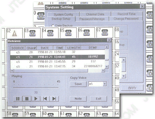 當(dāng)電話打進來,系統(tǒng)便自動進行錄音,系統(tǒng)把語音信號以數(shù)字化語音格式寫入硬盤。同時系統(tǒng)記錄其通話日期,摘機時間,掛機時間和當(dāng)前通話時間等信息,如果該次電話為打出電話,還可記錄其打出的電話號碼。掛機時系統(tǒng)便會自動停止錄音。 |