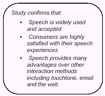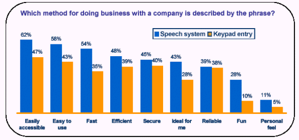 此外,十個(gè)人中九個(gè)人認(rèn)為他們從使用語音服務(wù)中得到了在鍵盤式服務(wù)中得不到的價(jià)值不菲的好處,并有70%的人說如果語音服務(wù)系統(tǒng)取代了按鍵式系統(tǒng)的話,他們的效率也將得以提高。