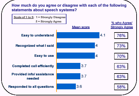 被訪問者們例舉了語音系統(tǒng)的很多優(yōu)點(diǎn)。超過75%的人認(rèn)為語音服務(wù)方便易用,有三分之二的使用者說語音服務(wù)不僅為他們提供了準(zhǔn)確的信息同時(shí)也為他們節(jié)省了等待客戶服務(wù)員的時(shí)間。