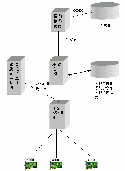 北京市建筑市場專家評標抽取通知系統(tǒng)是靈訊科技有限公司采用加拿大Eicon網絡公司的Diva Server 4BRI 卡開發(fā)的一套高效的外撥通知系統(tǒng),該系統(tǒng)充分體現(xiàn)了Eicon網絡公司 Diva Server 4BRI卡強大的語音功能以及系統(tǒng)的穩(wěn)定性,準確地識別了外撥手機的遇忙、無人、不再服務區(qū)、關機、空號等狀態(tài),實現(xiàn)了對手機狀態(tài)的全面監(jiān)控,全面解決了模擬語音卡對外撥手機信號無法判斷的問題。具體的系統(tǒng)架構如下:![]()