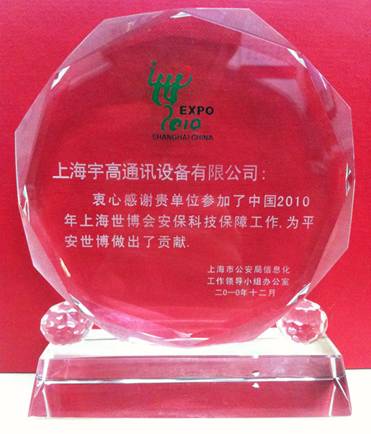 CTI論壇(ctiforum)1月26日消息(記者 潘婷婷):2011年新年伊始,上海市公安局授予上海宇高通訊設備有限公司(以下簡稱宇高通訊)“2010世博會安保貢獻獎”,并向我司在“平安世博”行動中作出的努力表示感謝。