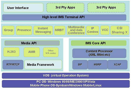 手機(jī)包括Symbian、Windows Mobile、Linux等版本,涵蓋當(dāng)前絕大多數(shù)高端手機(jī)用戶。除具有包括視頻通話的基本功能、呈現(xiàn)、群組管理與即時(shí)消息功能外,還擴(kuò)展了IP Centrex、多媒體彩鈴、VCC、CSI等功能。