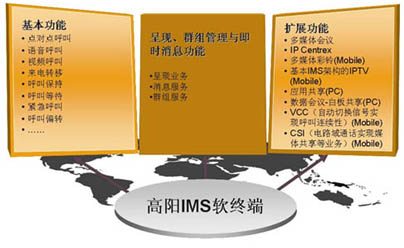 高陽IMS軟終端產(chǎn)品線是基于IMS(IP多媒體子系統(tǒng))技術(shù),以通信終端功能為主,融入IT特性,將在線狀態(tài)、即時(shí)消息和群組管理融為一體,集合語音、數(shù)據(jù)、視頻通信,提供統(tǒng)一的用戶體驗(yàn),實(shí)現(xiàn)移動(dòng)電話、PC之間的互聯(lián)互通,并且符合3GPP/ETSI/OMA/IETF/ITU-T等國際標(biāo)準(zhǔn)組織和中國電信/中國移動(dòng)規(guī)定的IMS相關(guān)規(guī)范。