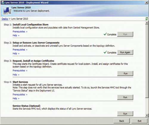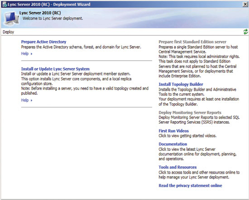 準(zhǔn)備好基礎(chǔ)結(jié)構(gòu)并發(fā)布拓?fù)浜,即可開始安裝前端服務(wù)器和服務(wù)器角色,以啟用 A/V 會(huì)議、企業(yè)語(yǔ)音、監(jiān)控、存檔及其他功能。準(zhǔn)備每臺(tái)服務(wù)器從運(yùn)行部署向?qū)В▍⒁妶D 3)開始,但每個(gè)服務(wù)器角色都有自己的安裝和配置要求。您可以在 TechNet 庫(kù)的“部署 Lync Server 2010 Standard Edition”部分查找更多詳細(xì)信息。
