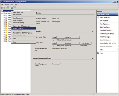 感到滿意后,可使用拓?fù)渖善鱽眚?yàn)證拓?fù)洹H绻鳛橛行負(fù)渫ㄟ^驗(yàn)證,則可以發(fā)布。發(fā)布拓?fù)鋾r(shí),Lync Server 會(huì)將拓?fù)浯嫒胫醒牍芾泶鎯?chǔ)。如果尚未創(chuàng)建中央管理存儲(chǔ),Lync 會(huì)在您提供有效拓?fù)洳?zhǔn)備發(fā)布拓?fù)鋾r(shí)創(chuàng)建中央管理存儲(chǔ)。在所處環(huán)境的各臺(tái)服務(wù)器上安裝 Lync Server 時(shí),服務(wù)器會(huì)從中央管理存儲(chǔ)讀取拓?fù),并安裝自身以配合其在您的部署中的角色。