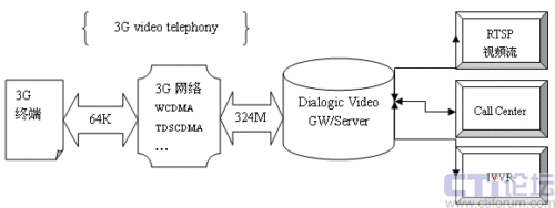 另一類業(yè)務(wù),我舉個(gè)例子,像比較近的香港CSL移動(dòng)電視,也是通過3G視頻電話打進(jìn)去在IVVR的幫助下選擇頻道,IVVR和流媒體服務(wù)器相連,就可以向3G用戶播放實(shí)時(shí)視頻內(nèi)容了。流媒體服務(wù)器是來(lái)自互聯(lián)網(wǎng)的應(yīng)用,互聯(lián)網(wǎng)上的實(shí)時(shí)轉(zhuǎn)播通過RTSP技術(shù),我們的IVVR也是利用了RTSP技術(shù)與實(shí)時(shí)內(nèi)容進(jìn)行互動(dòng)。這就是所謂的3G視頻點(diǎn)播。